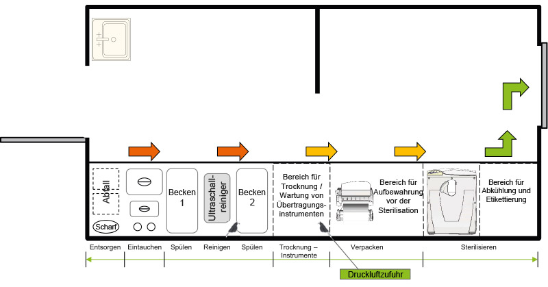 Die Anordnung der einzelnen Arbeitsbereiche und Geräte richtet sich nach der Reihenfolge der Aufbereitungsschritte, d.h. Vordesinfektion, Spülen, Reinigen, Trocknen, Verpackung und Sterilisation. Der entsprechende Raum soll nicht für andere Zwecke genutzt werden. Fußböden und Arbeitsflächen sollen glatt sein, keine scharfen Ecken und Kanten haben und leicht zu reinigen und zu desinfizieren sein.