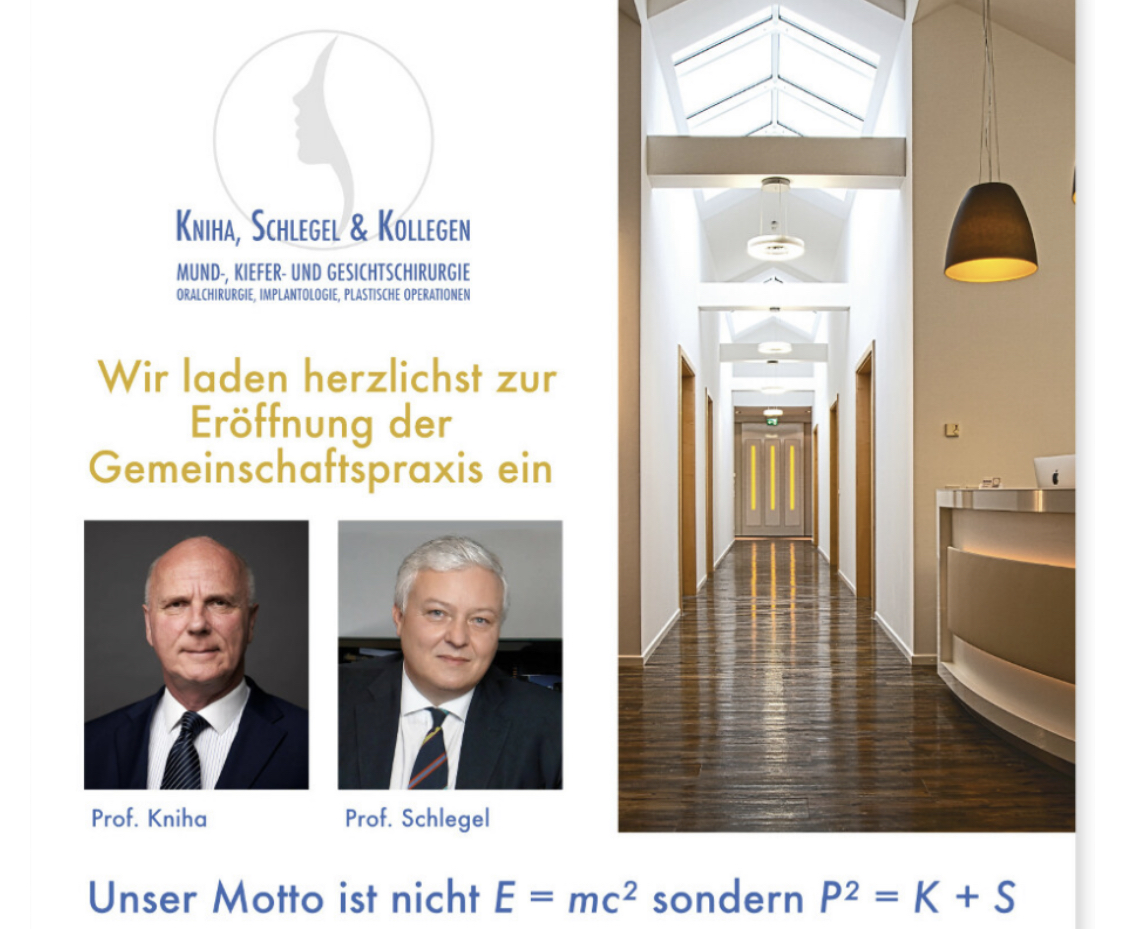 Hinter dieser schicken Formel verbirgt sich nichts anderes, als die Hochzeit zweier Münchner Professoren. K + S steht nämlich für keine geringeren Herren als Prof. Kniha und Prof. Schlegel (hier dürfte jetzt auch der Ursprung des P2 erkennbar sein). Diese haben sich zur Eröffnung einer Gemeinschaftspraxis für MKG-Chirurgie entschieden und dieses neue Bündnis durch eine große Sause zünftig gefeiert. Rund 200 geladene Gäste fanden den Weg ins Renaissancehaus München und verbrachten ausgeladene Stunden anlässlich der Praxis-Opening-Party.