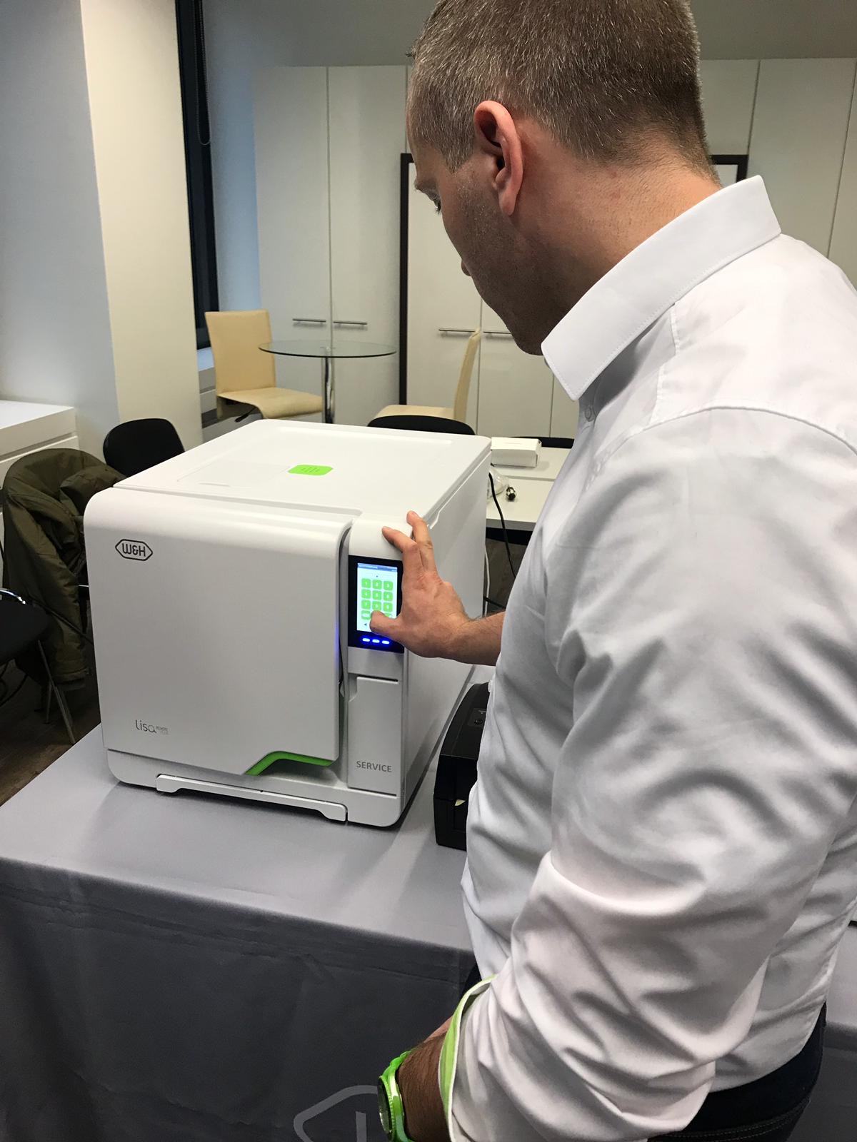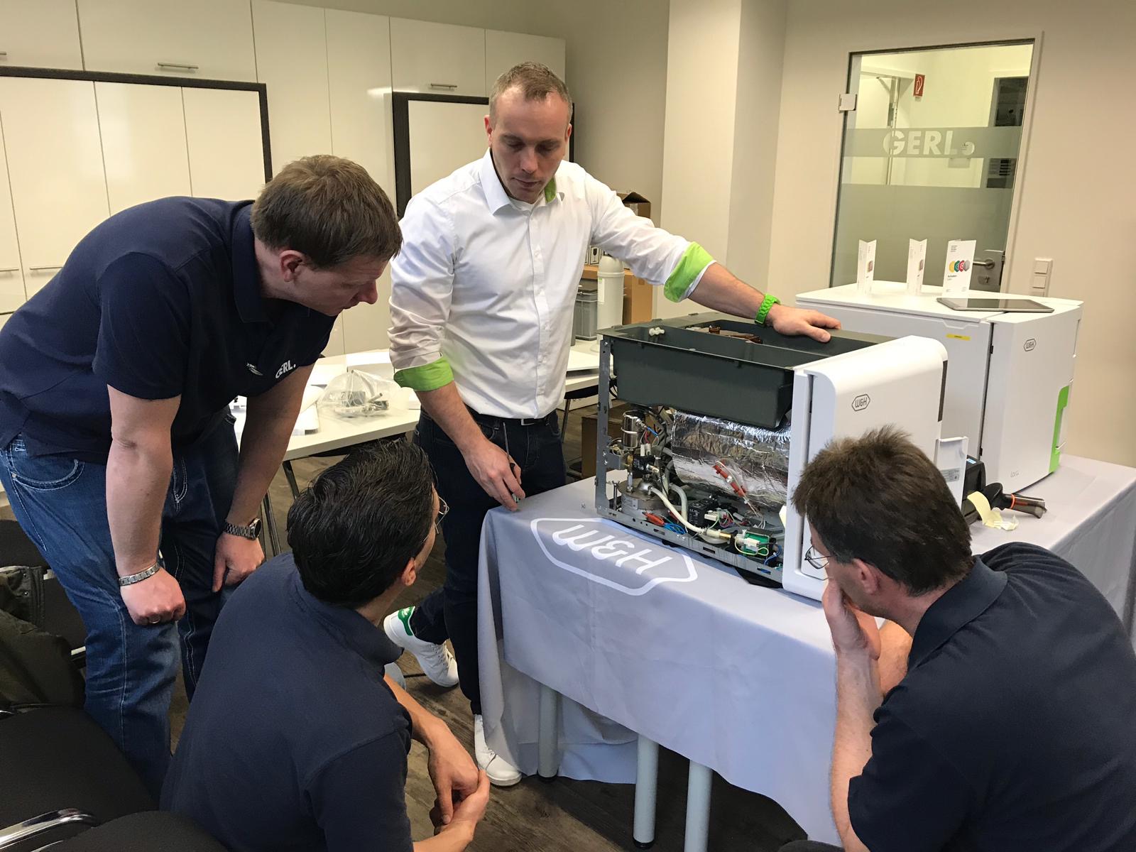 Unser Technischer Leiter Josef „Josi“ Erbschwendtner nennt es ganz korrekt: „Technische Produktschulung W&H Steri´s“. Geschult werden die Techniker zu den neuen Features, es muss ja in den Praxen schließlich eine sichere und verständliche Einweisung erfolgen. Dabei geht’s zu Beginn immer erst einmal ans Eingemachte – jede Schulung startet mit dem Entkleiden der beiden Hübschen. Dann darf ein bisschen gefummelt werden, natürlich ohne sich dabei die Finger zu verbrennen. Wer es noch nicht wusste: W&H ist mittlerweile Vollanbieter der gesamten Hygienekette in der zahnärztlichen Praxis. Wir können Hygiene also perfekt! :-)