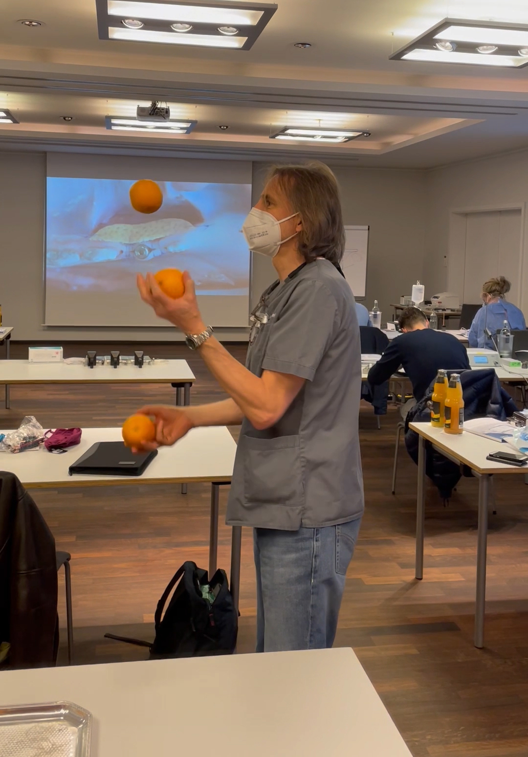 Der Januar hatte es dann gleich in sich … Fortbildung hoch 10! Am Start: Prof Dr. „Michl“ Stimmelmayr gleich mit einer Showeinlage … Spaß muss sein und so hat er uns seine Jonglierfähigkeiten demonstriert, natürlich mit Orangen bevor die Übungen zum FST, dem freien Schleimhaut-Transplantat, folgen. Tipp: Einfach mal einen Kurs mit „Michel“ besuchen. Hier gibt es allerhand zu lernen.