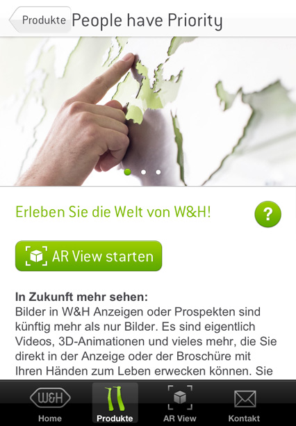 Durch W&H Augmented Reality (AR) werden reale Welt und virtuelle Welt vereint. Bilder in W&H Anzeigen oder Prospekten sind künftig mehr als nur Bilder. Es sind eigentlich Videos, 3D-Animationen und vieles mehr, die Sie direkt in der Anzeige oder der Broschüre mit Ihren Händen zum Leben erwecken können.