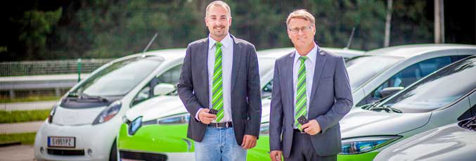 Thomas Koch (li.), Fuhrparkbeauftragter bei W&H, und Ing. Herbert Traschwandtner (re.), Mitglied der W&H Geschäftsleitung, freuen sich über den jüngsten Zuwachs an Elektrofahrzeugen. Damit soll der Werk-Verkehr in Bürmoos künftig 100% emissionsfrei gestaltet werden.