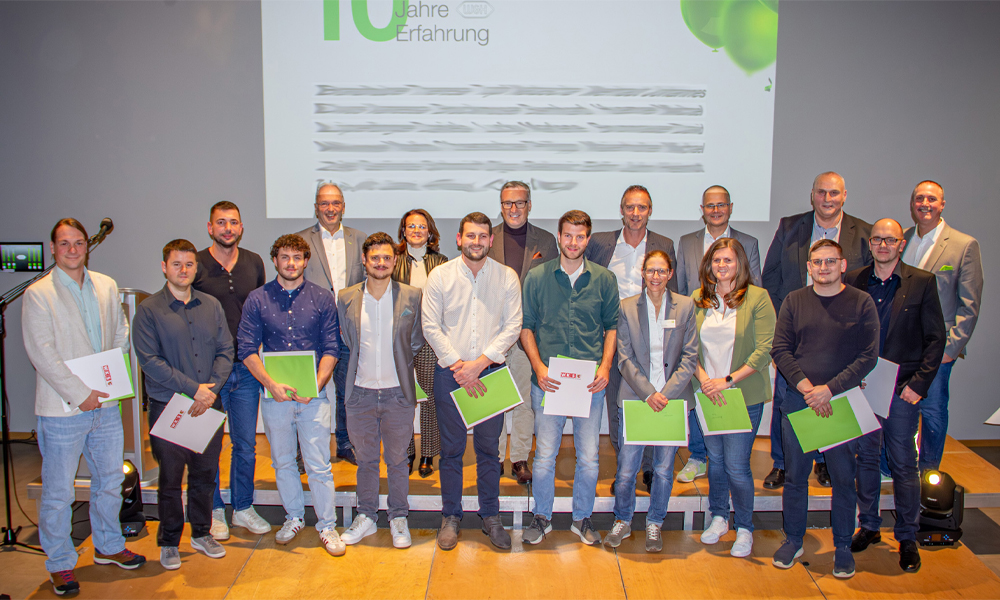 The picture shows the employees celebrating 10 years of employment.