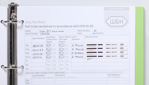 The W&H Premium Care Logbooks, which are available as part of our Premium Care Service packages, are designed to make compliance with national guidelines simple. Logbooks for the Lisa and Lina vacuum B sterilizers contain four years' worth of pages for you to store your daily Helix test strips, along with clear record sheets for your weekly tests. There is also a maintenance record, so all of your information can be kept in one place. Simplicity is key.