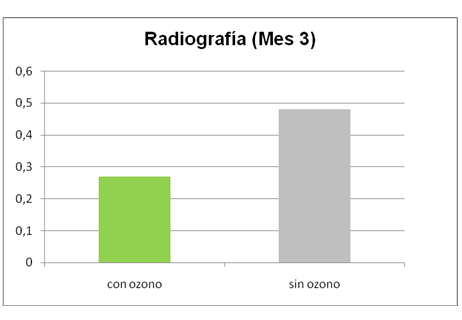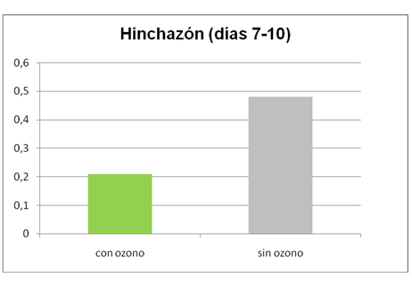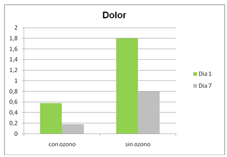 El dolor postoperatorio el 1º día +/- 1 y entre los días 7-10 +/-1 se presenta en una escala de dolor entre 0 y 10, como se muestra a continuación en la figura. No se alcanzó el dolor máximo de 10. Con la utilización intraoperatoria del ozono se observó una reducción del dolor postoperatorio el 1er día y entre los días 7-10, en comparación con el grupo de pacientes sin aplicación intraoperatoria del ozono.