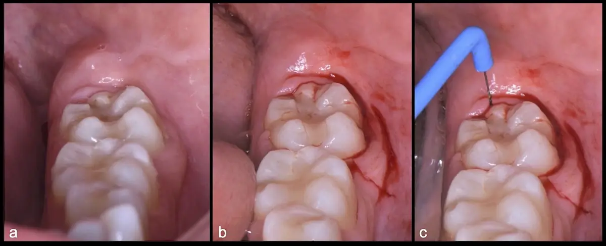 El procedimiento se inicia colocando anestesia troncular para bloqueo del nervio dentario inferior y sus ramas. Luego, se establecerá el diseño de acceso según la disposición de la molar a extraer. Para fines didácticos, se explicará cómo se realizaría la extracción de la molar de la Figura 1: se realiza una incisión horizontal a nivel de la zona retromolar hasta llegar a distal de la segunda molar, continuándose con una incisión intrasurcular hasta mesial de la segunda molar, finalizando con una incisión vertical a espesor total hasta llegar a la línea mucogingival (Figura 2).