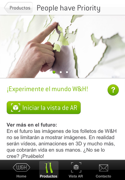 Con la tecnología W&H Augmented Reality (AR), se combinan el mundo real y el virtual. En el futuro las imágenes de los anuncios y folletos de W&H serán mucho más que imágenes. Serán vídeos, animaciones 3D y mucho más, que cobrarán vida en sus manos.