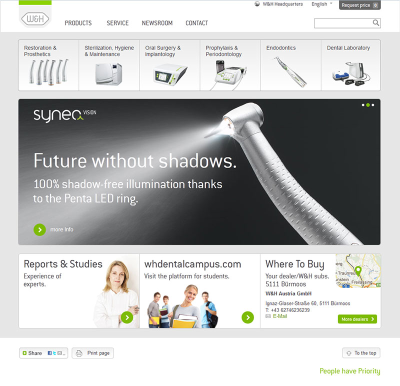 Muchos más contenidos, la más innovadora tecnología, un diseño moderno y la máxima sencillez. Así es como se presenta la nueva web de W&H Dentalwerk Bürmoos GmbH. "El equipo del proyecto tuvo libertad absoluta para la creación y la puesta en práctica de nuevas ideas. La única premisa para el equipo era que la nueva web estuviera orientada por completo a las necesidades de los clientes y las personas interesadas y que se centrara en sus deseos", explica la Sra. Martina Banze, directora de marketing en W&H.