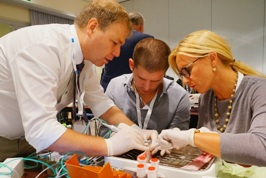 Bajo la dirección experta del Dr. med. dent. Mario Kirste MSc (a la izquierda) y el Dr. med. dent. Stavros Pelekanos, los participantes del taller pudieron probar distintas aplicaciones quirúrgicas y, así, conocieron las ventajas que presenta el equipo quirúrgico Piezomed.