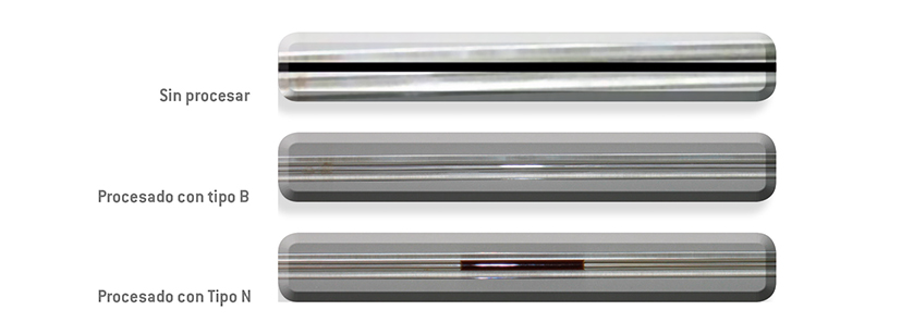La imagen inferior (de tipo N) demuestra que el vapor no puede eliminar el líquido del centro del lumen del tubo. Por lo tanto, la superficie interna no habría sido esterilizada.