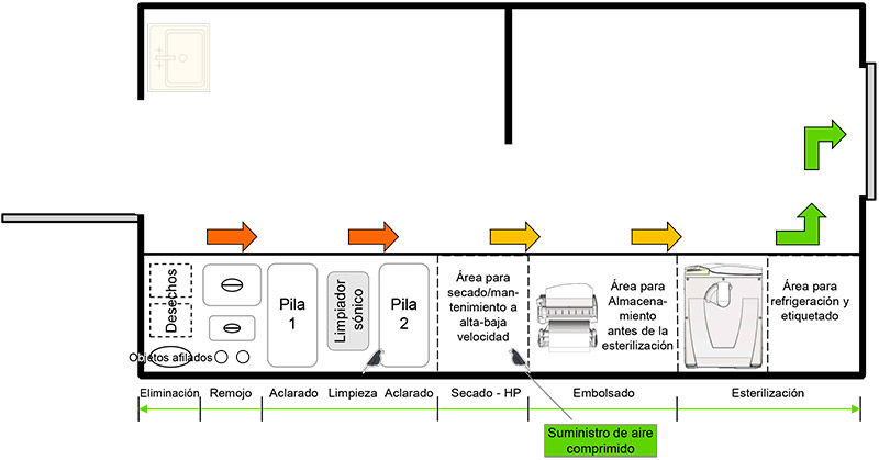 La configuración de cada área de trabajo y de cada dispositivo debe seguir los pasos de reprocesamiento, es decir, desinfección previa, aclarado, limpieza, aclarado, secado, envasado y esterilización. Esta sala no se utilizará para ningún otro propósito. Los suelos y las superficies de trabajo deben ser suaves y lisas, sin esquinas o bordes afilados y, además, tienen que poder limpiarse y desinfectarse con facilidad.