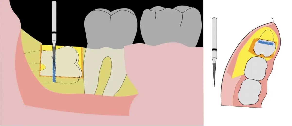 El procedimiento se inicia colocando anestesia troncular para bloqueo del nervio dentario inferior y sus ramas. Luego, se establecerá el diseño de acceso según la disposición de la molar a extraer. Para fines didácticos, se explicará cómo se realizaría la extracción de la molar de la Figura 1: se realiza una incisión horizontal a nivel de la zona retromolar hasta llegar a distal de la segunda molar, continuándose con una incisión intrasurcular hasta mesial de la segunda molar, finalizando con una incisión vertical a espesor total hasta llegar a la línea mucogingival (Figura 2).