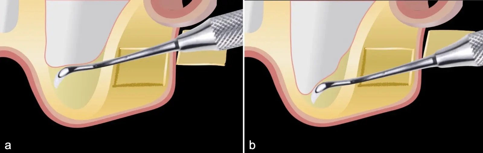 Se inicia la elevación de la membrana de Schneider con el inserto redondeado no cortante en forma de disco, empleando movimientos suaves. El levantamiento puede complementarse con elevadores convencionales, siguiendo la dirección mesiodistal. La fase de desprendimiento inicia con el piso y sigue hacia la pared mesial para terminar, y de ser necesario, hacia la pared posterior. Existen diversos insertos con angulaciones y longitudes para mayor accesibilidad16 (Figura 1).