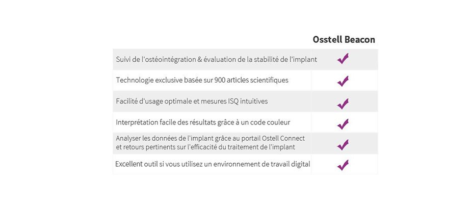 Il s’agit de la seule méthode objective d’assurance qualité qui vous avertit rapidement si l’ostéo-intégration ne se déroule pas comme prévu et vous procure davantage de sécurité, à vous et à votre patient.Fonctionnalités de l'Osstell Beacon