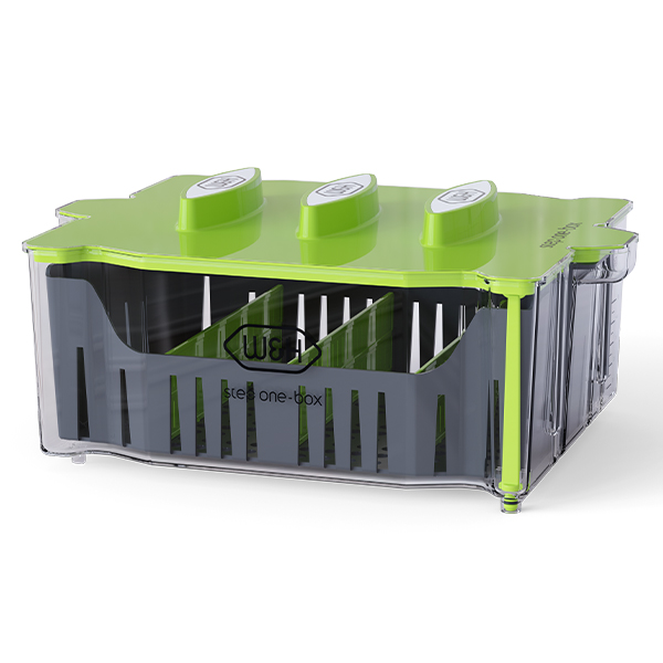 Un égouttoir indépendant est inclus dans la Step One-Box. Un support intégré permet de poser l'égouttoir sur la boîte, afin d'égoutter les instruments à l'intérieur de la box. Cette fonction innovante limite la contamination de la paillasse en salle de stérilisation.Les avantages en un clin d'œil