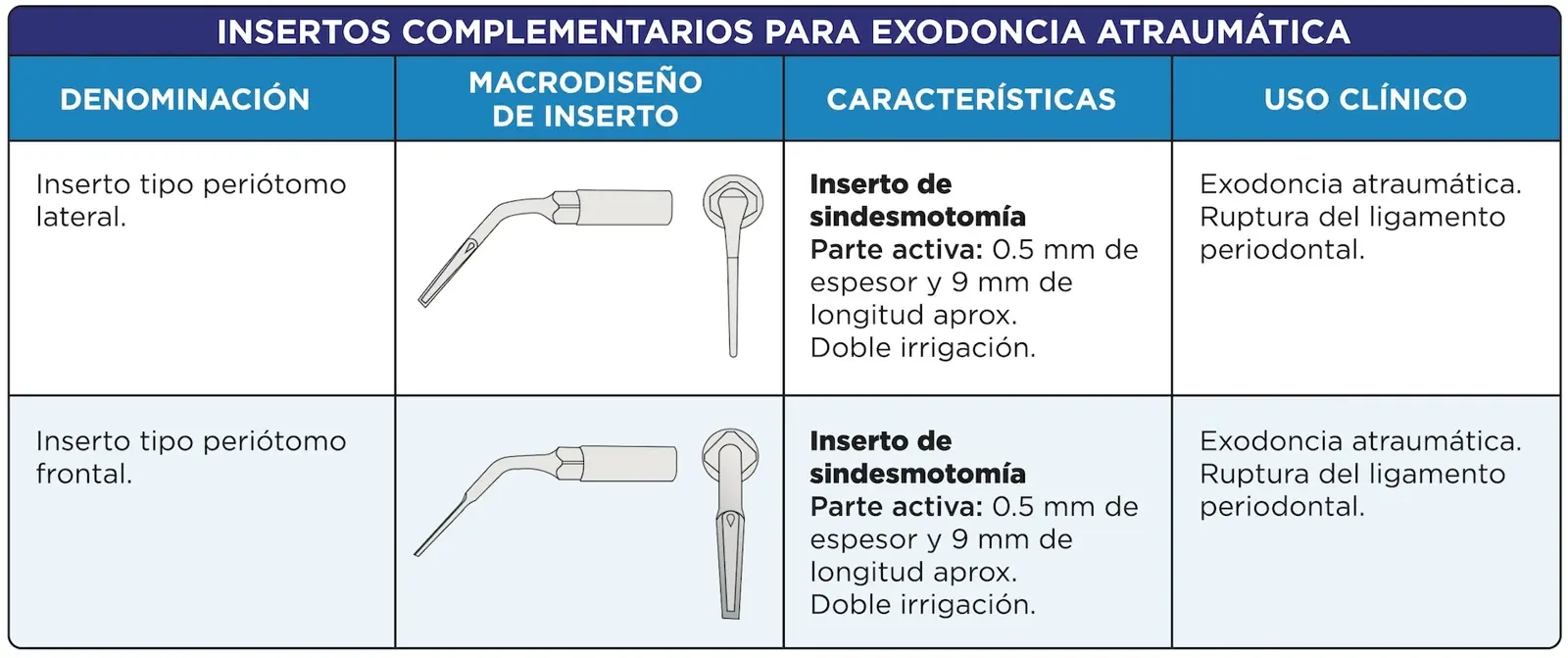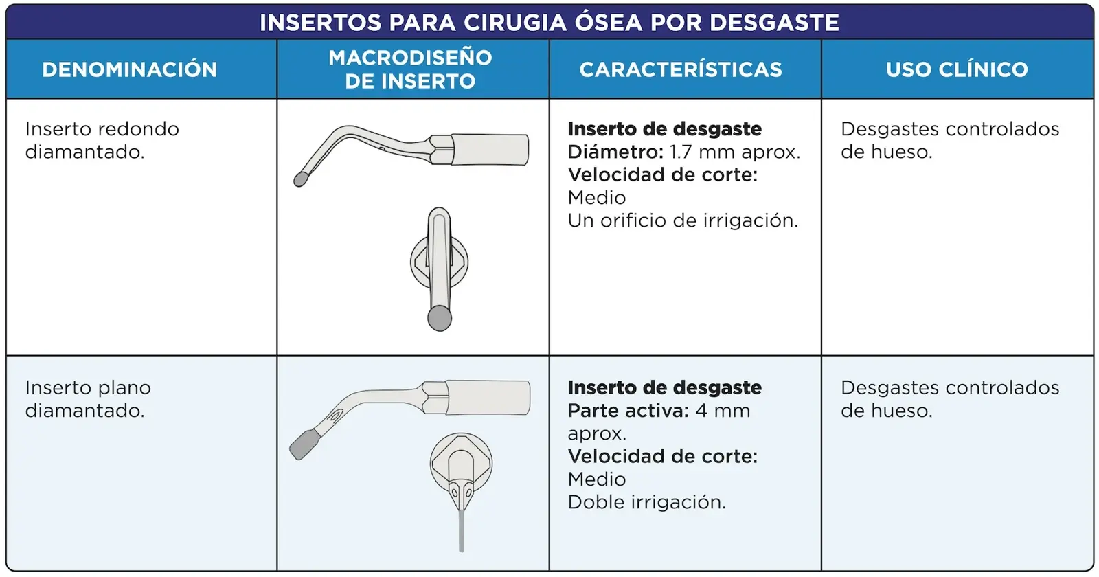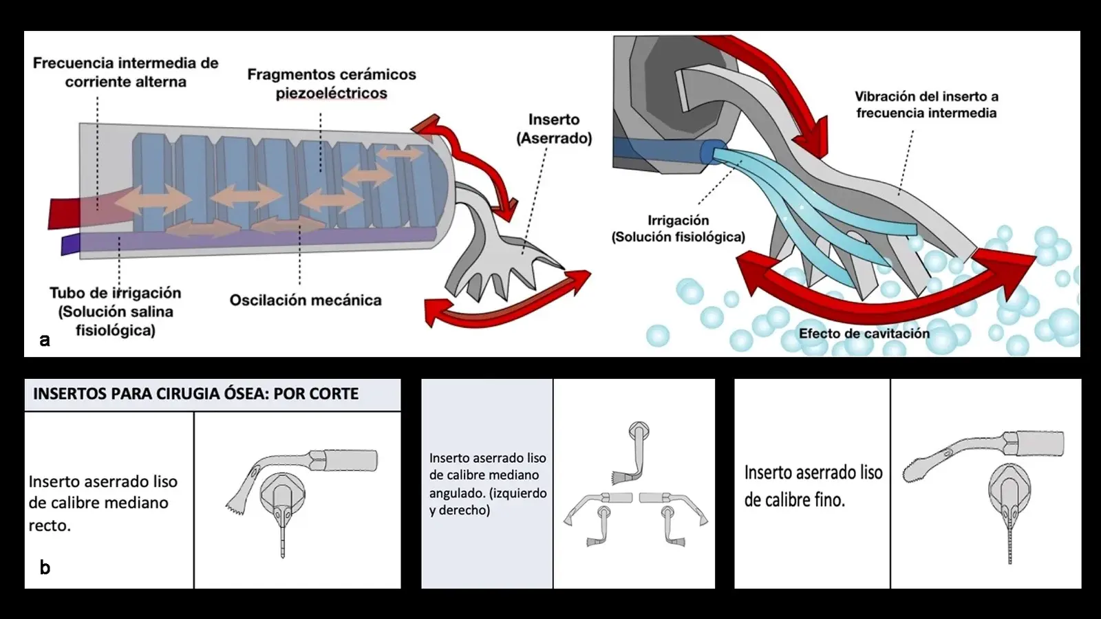 Las vibraciones de baja frecuencia suelen emplearse en tratamientos de conductos; las de alta en limpieza de superficies dentarias o alisamientos radiculares y óseo. El modo potenciado es el de elección para osteoplastías y osteotomías. El patrón de oscilación potenciado se caracteriza por movimientos alternados entre la máxima y mínima frecuencia (30hz), con la finalidad de evitar que, al impactar sobre el hueso, el inserto produzca un sobrecalentamiento mientras se produce el corte. La irrigación que acompaña la activación de las puntas debe ser profusa. Usualmente se emplea suero fisiológico a 4°C. Los movimientos de activación deben ser intermitentes y la presión ejercida debe ser mínima, sin fuerza excesiva, permitiendo un seccionamiento preciso. En casos de osteotomías profundas, se pueden usar instrumentos convencionales de manera auxiliar, ya que, si el inserto se detiene y no realiza el efecto cortante, solo producirá elevación de la temperatura con un consecuente daño tisular.5