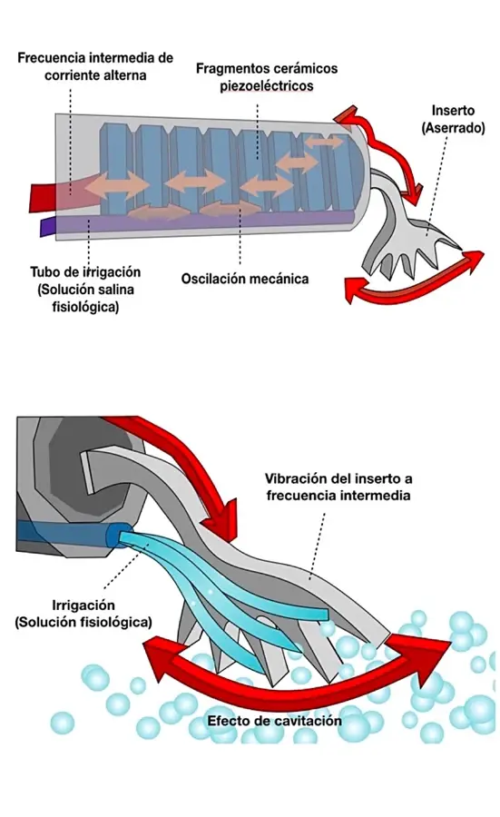 El equipo está conformado por la pieza de mano piezoeléctrica, conectada y soportada a la unidad principal de energía, la cual también tiene salidas de irrigación. Un interruptor de pie activa la pieza de mano en donde se intercambian los insertos. La frecuencia de las vibraciones, el poder de corte y la cantidad de la irrigación pueden ser ajustadas. La frecuencia se establece normalmente entre los 25 y 30 kHz. Causa microvibraciones de amplitud que fluctúan entre los 60-210um,1 proporcionando una potencia de corte superior a los 5W.5,6,7