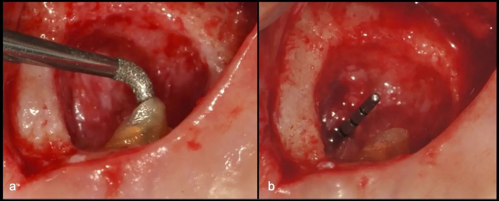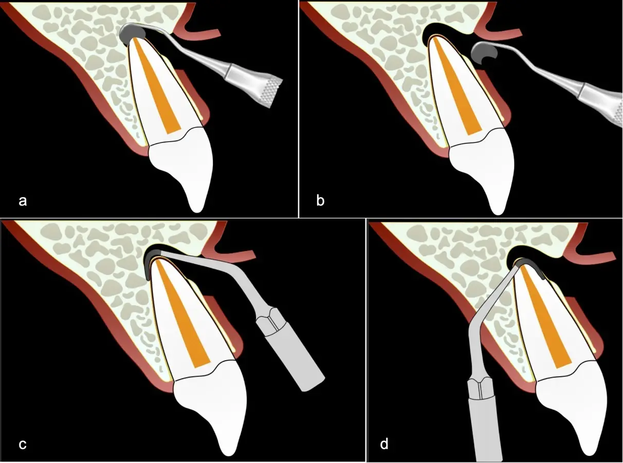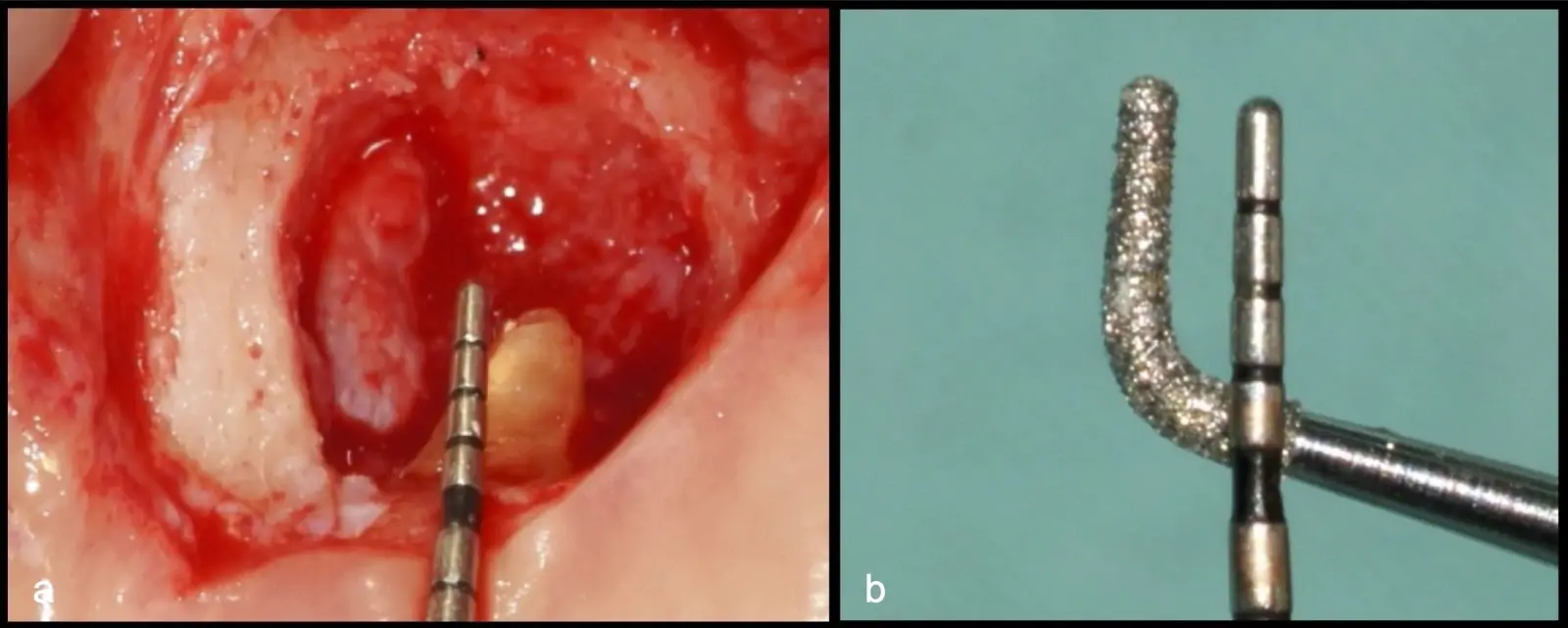 Después de realizado el acceso e identificado el ápice, se procede a la limpieza de la zona con instrumentos manuales y/o con insertos diamantados de parte activa angulada para poder eliminar todo el tejido patológico del perímetro radicular apical y del tejido óseo circundante (Figura 6).