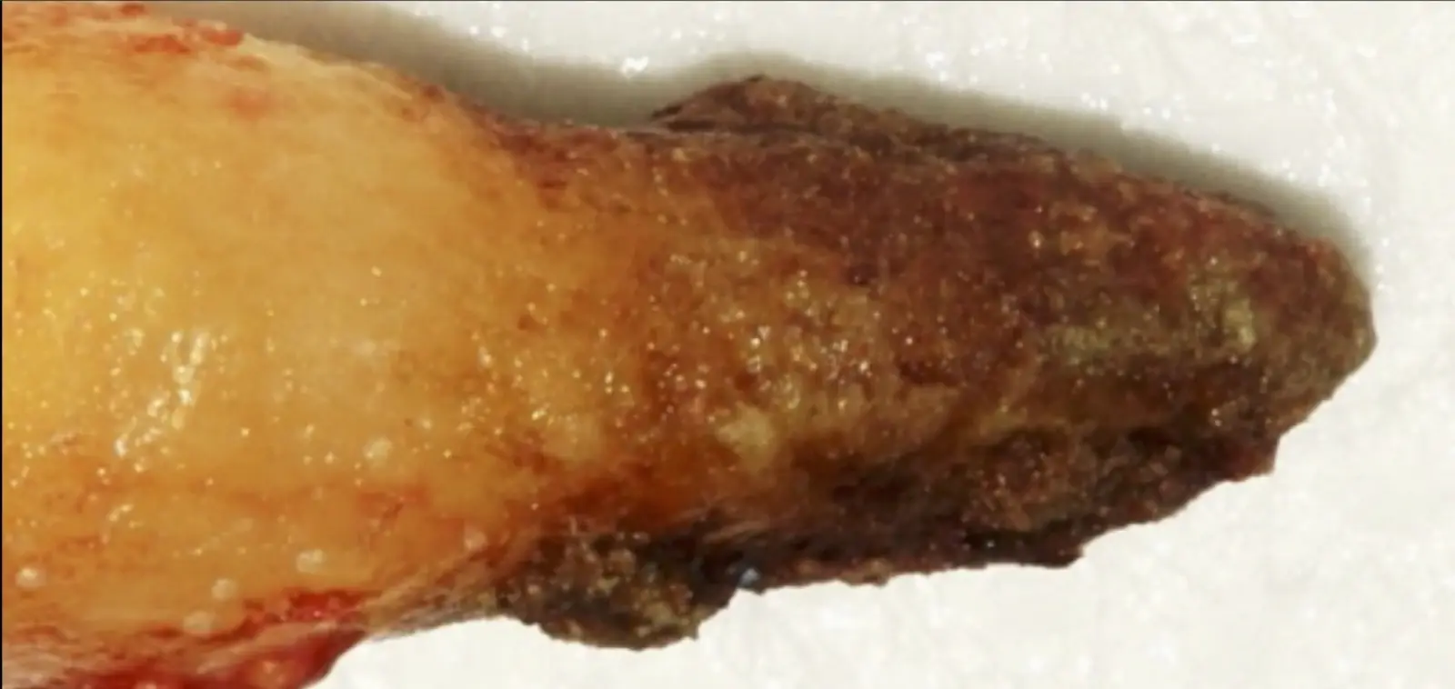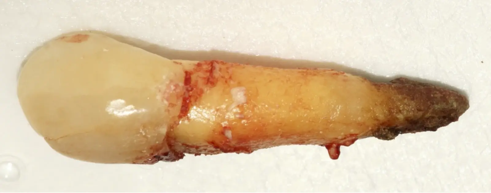 Una vez limpia la zona apical, se corrobora la integridad de la raíz y se evalúa el grado de extensión de la lesión. Si el defecto óseo es pequeño, se procede a realizar la preparación del conducto y obturación retrógrada de ser el caso. Si el defecto óseo es de gran tamaño e inaccesible a los insertos, se procede a realizar un corte de por lo menos 3 mm de ápice radicular conteniendo los posibles conductos aún infectados11 empleando habitualmente insertos de borde aserrado con/sin marcas de medición para un trabajo seguro7 (Figura 7).