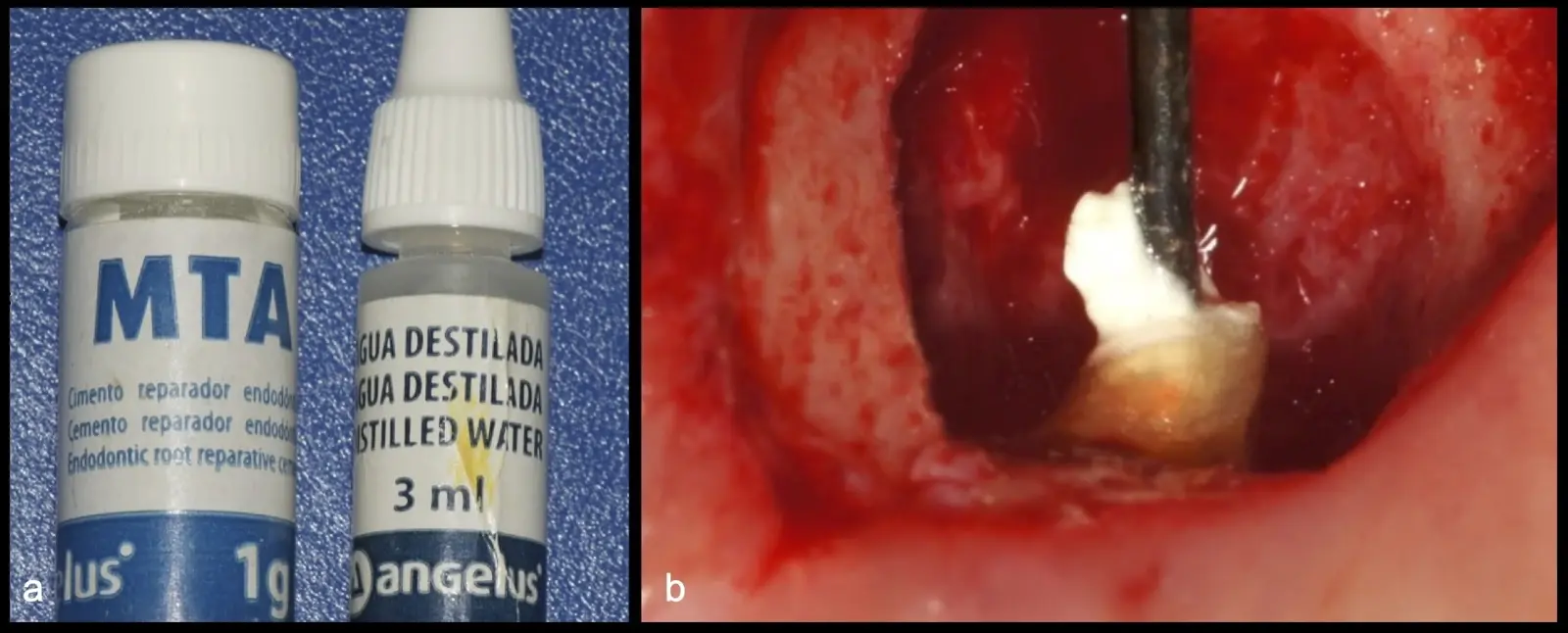 Para la obturación retrograda, el sellador más usado es el agregado de trióxido mineral (MTA)21 por sus propiedades hidrofílicas y de biocompatibilidad que favorece la neoformación ósea.3 Luego de la desinfección y secado, se realiza la obturación-compactación de rutina y se culmina con la reposición de los tejidos gingivales a través de puntos de sutura (Figura 10).
