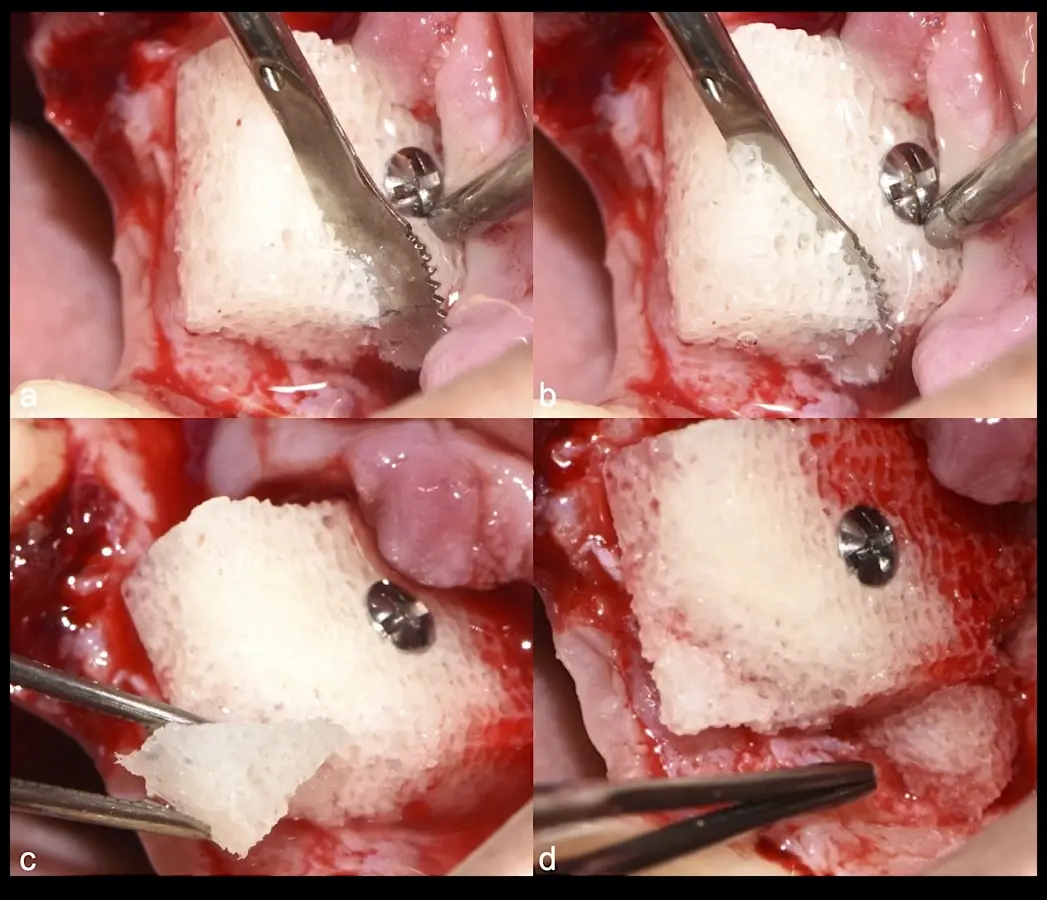 Figura 33. Pasos de la colocación de membranas de barrera y cierre sin tensiones (a - d).