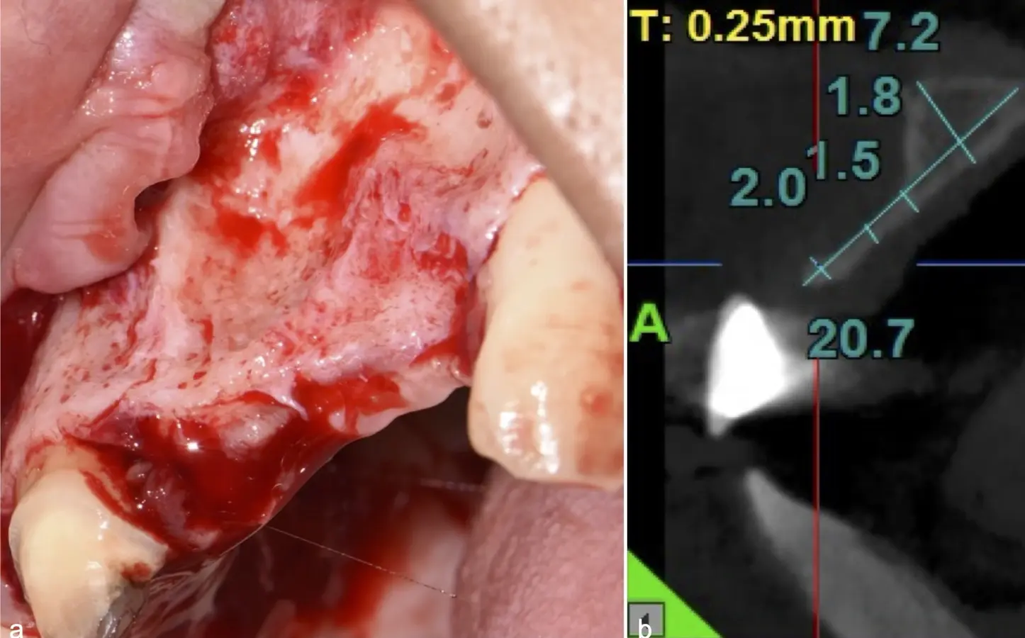 Figura 31. Dos vistas de la verificación de la extensión del colgajo para el cierre sin tensiones (a, b).