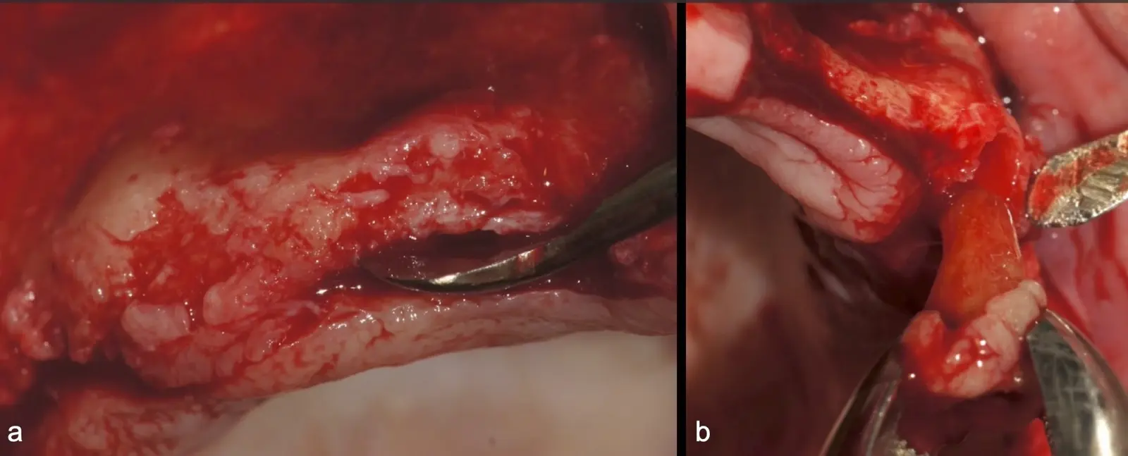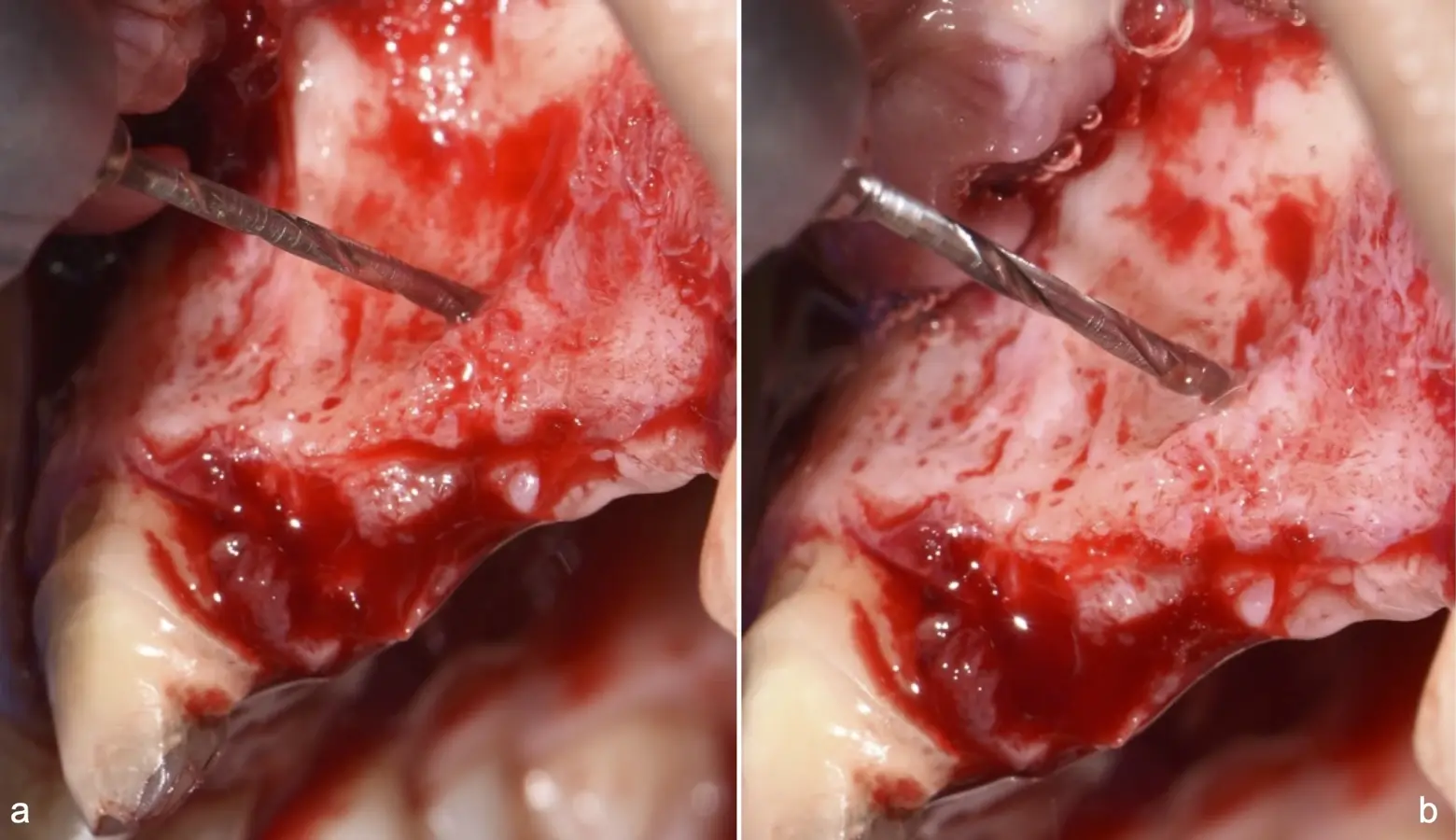 Figura 24. Imágenes de la verificación del sangrado proveniente de la zona medular (a, b).