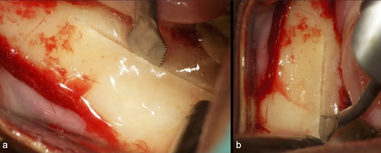 Figura 25. Zona donadora: dos ángulos de osteotomía con inserto de corte de punta aserrada demarcando los límites del bloque (a, b).
