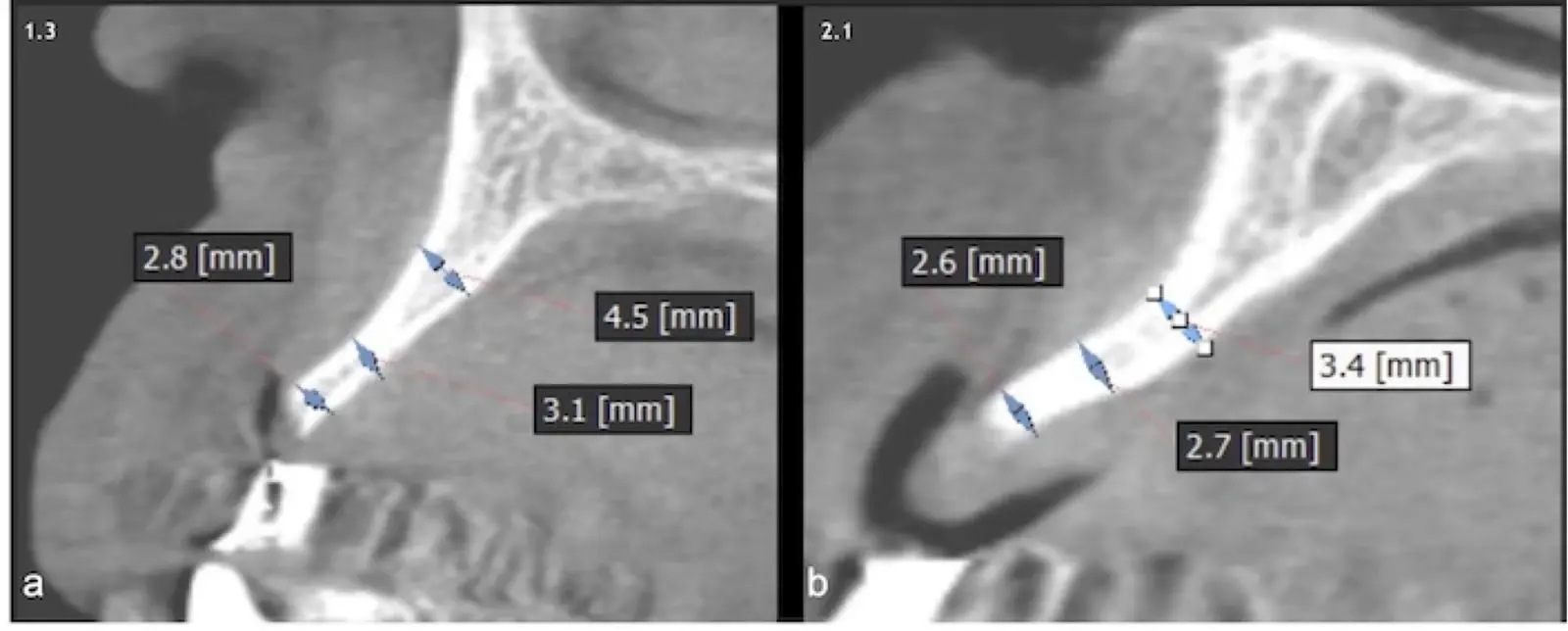 Figura 19. Tomografía computarizada de la zona receptora. Pieza 1.3 (a). Pieza 2.1 (b).