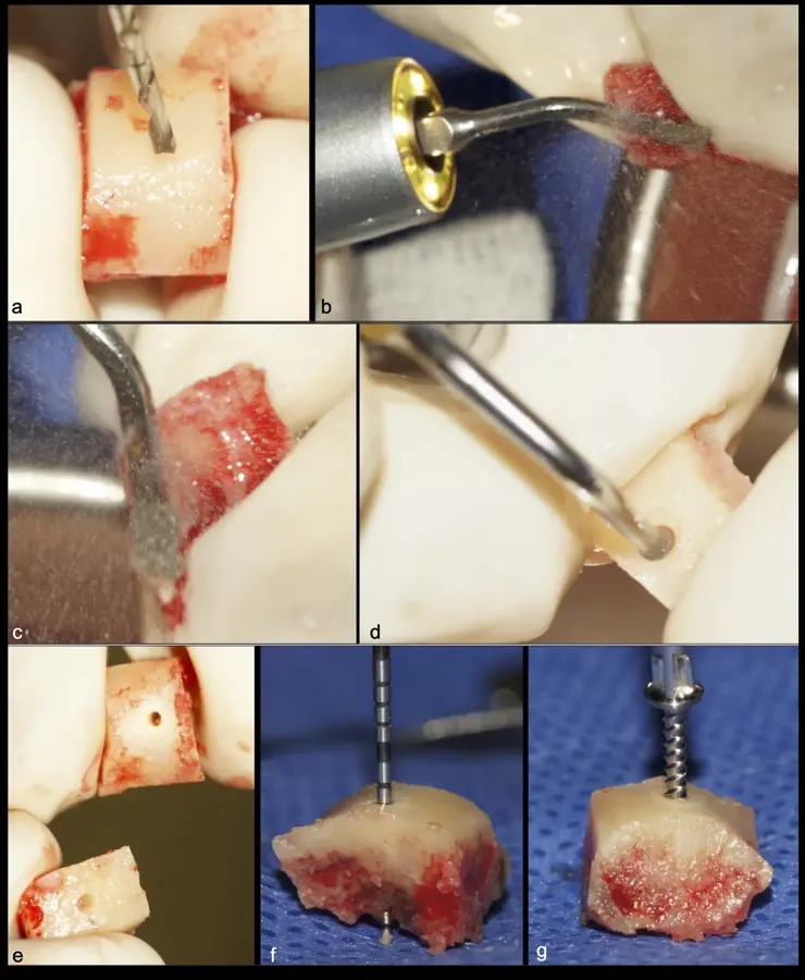 Figura 30. Imágenes de la preparación y moldeado del bloque, que incluyen la selección del tornillo de osteosíntesis (a - g).