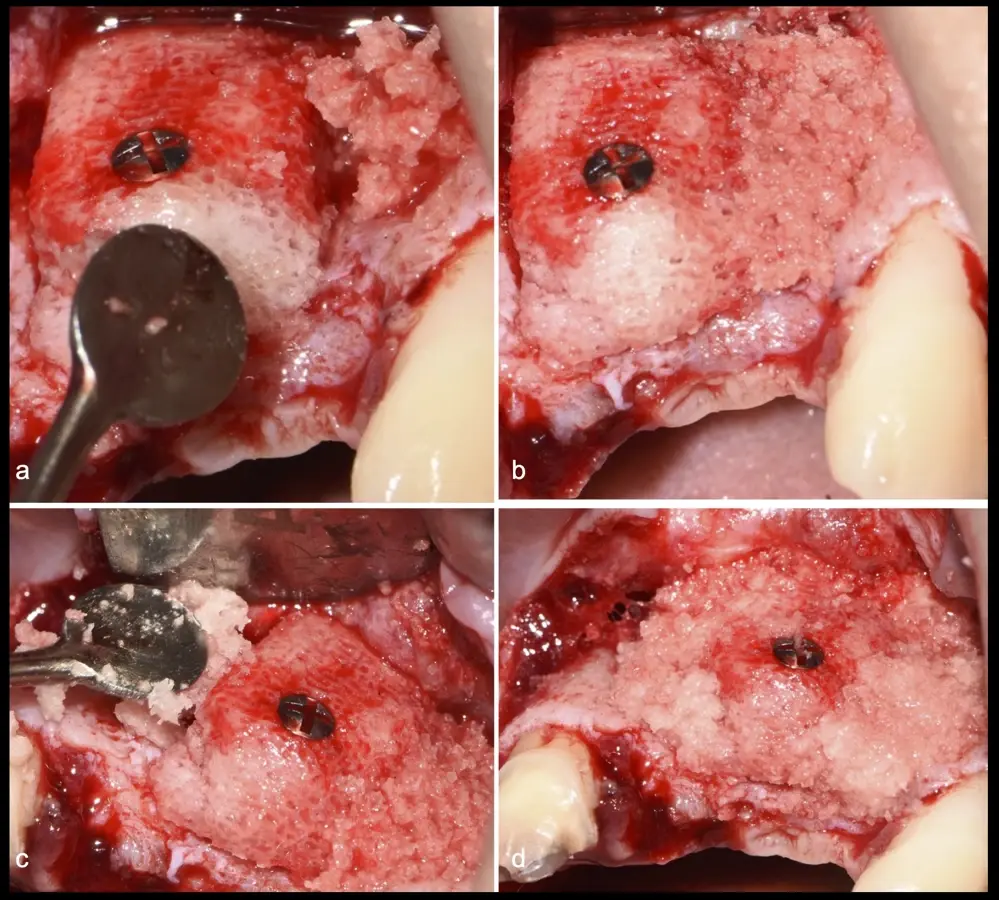 Figura 32. Secuencia de la colocación del biomaterial entre los bloques óseos (a - e).