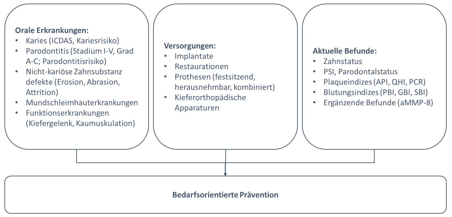 Figure 2: Needs-based prevention is determined by the patient’s oral health history, treatment status and current findings. The most important examples in the individual subdivisions are summarized in the figure.