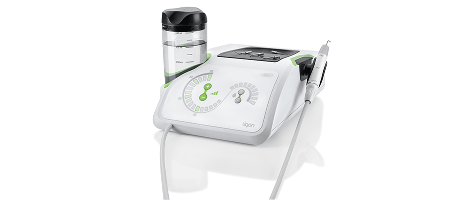 Плюс и минус: так легко работает новый прибор Tigon. Производительность инструмента для снятия зубного камня и расход охлаждающей жидкости увеличиваются и уменьшаются простым нажатием кнопок плюс и минус соответственно.