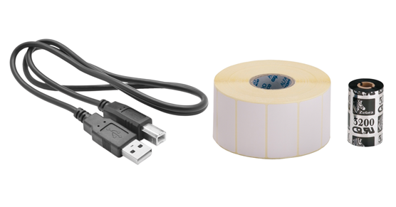 USB kabel, 1 rulle med 2100 etiketter, 1 vax/hartsband, aktiveringskodinstruktioner