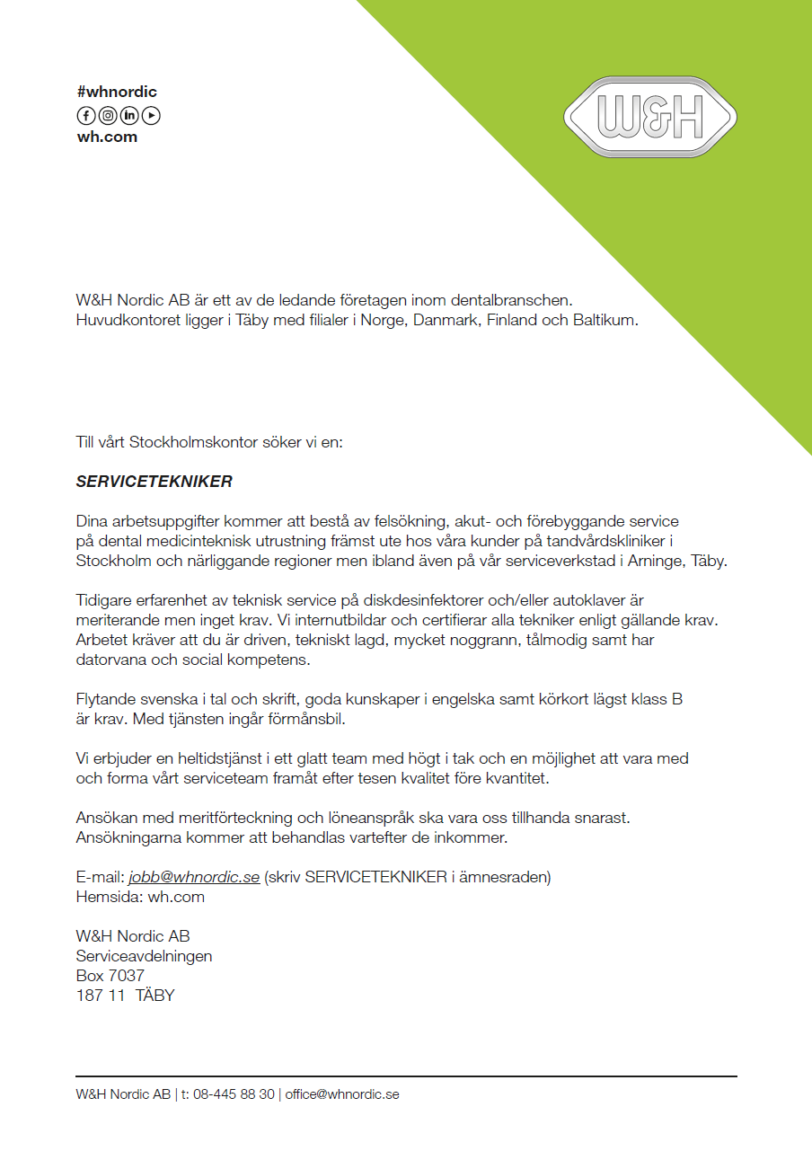 W&H Nordic är en etablerad leverantör av produkter till tandvården och har funnit i Norden sedan 1988. Idag är vi 27 anställda med huvudkontor i Täby strax norr om Stockholm. Här finns försäljning, lager och service. Utöver detta har vi filialer i Norge, Finland, Danmark samt Baltikum. Då vi representerar W&H följer vi samma värderingar och engagemang för kunden. Vi strävar ständigt efter förbättring för att kunna ge bästa service och support till våra kunder och partners.