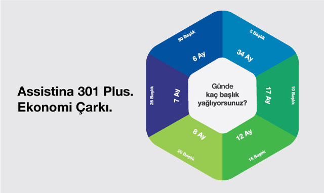 Günde 5 başlık yağlarsanız Assistina 301 Plus ilk satınalma maliyetini 34 ayda amorti eder.