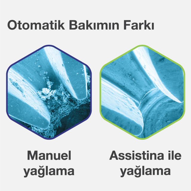 - Assistina 301 Plus, otomatik dönerek yağlama özelliği sayesinde yağı en iyi şekilde dağıtarak başlığın içerisinde homojen bir yağ katmanı oluşturur.